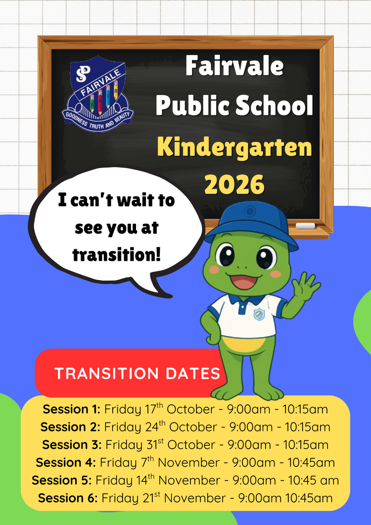 We are excited to welcome our Kindergarten 2026 students to Fairvale Public School. We have a number of events to support children transitioning to school. These include: